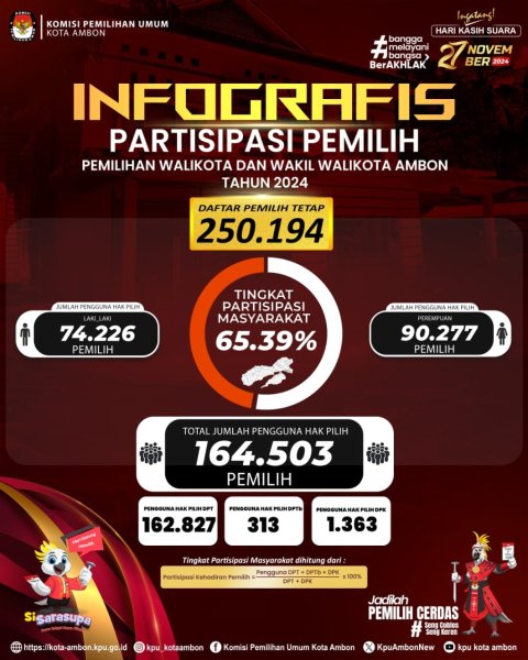 Berikut kami sampaikan infografis Tingkat Partisipasi Kehadiran Pemilih dalam Pemilihan Walikota dan Wakil Walikota Ambon Tahun 2024 sebesar 65,39℅. ....